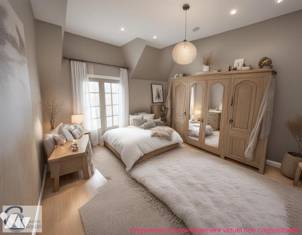 L'étage est composé d'un palier desservant deux chambres et une salle de douche avec wc.