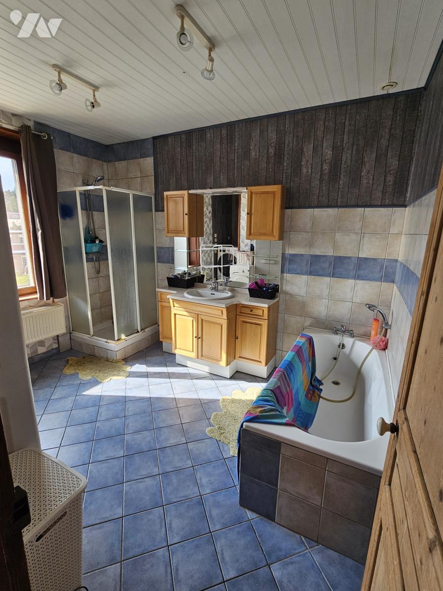 A l'étage : un palier qui dessert une salle de bains carrelée avec douche et baignoire et un emplacement lave-linge, deux chambres avec de beaux parquets, un bureau menant à l'étage.